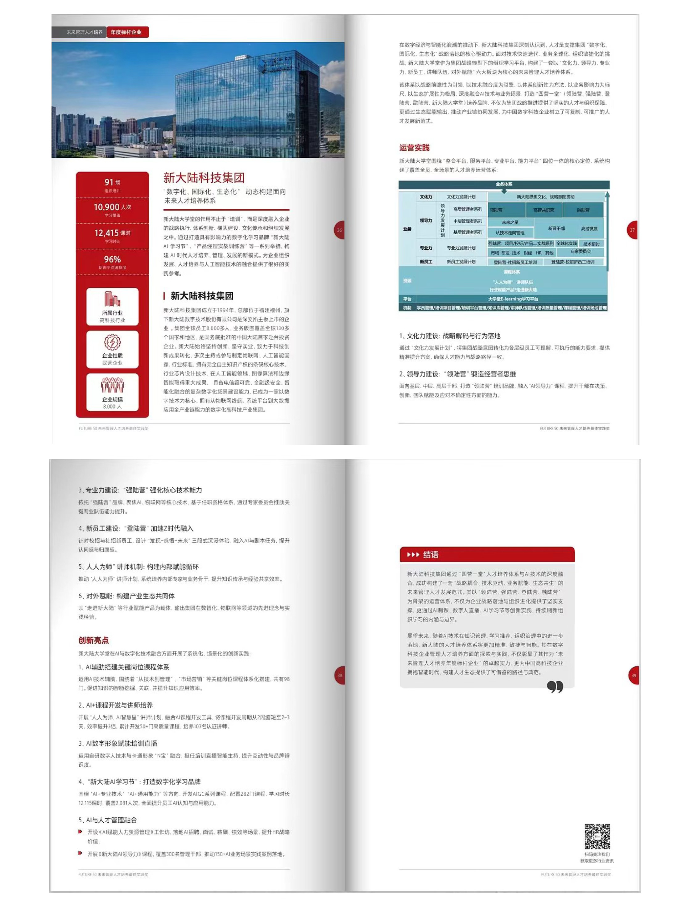 本屆評(píng)選同步推出年度精選案例集,新大陸圍繞 “四營(yíng)一堂” 搭建的人才培養(yǎng)體系、AI 技術(shù)與業(yè)務(wù)場(chǎng)景的融合實(shí)踐,憑借突出的可復(fù)制性與落地價(jià)值成功入選,相關(guān)實(shí)踐經(jīng)驗(yàn)在案例集中以 4 頁(yè)篇幅進(jìn)行深度收錄,成為行業(yè)人才培養(yǎng)的重要參考范本。